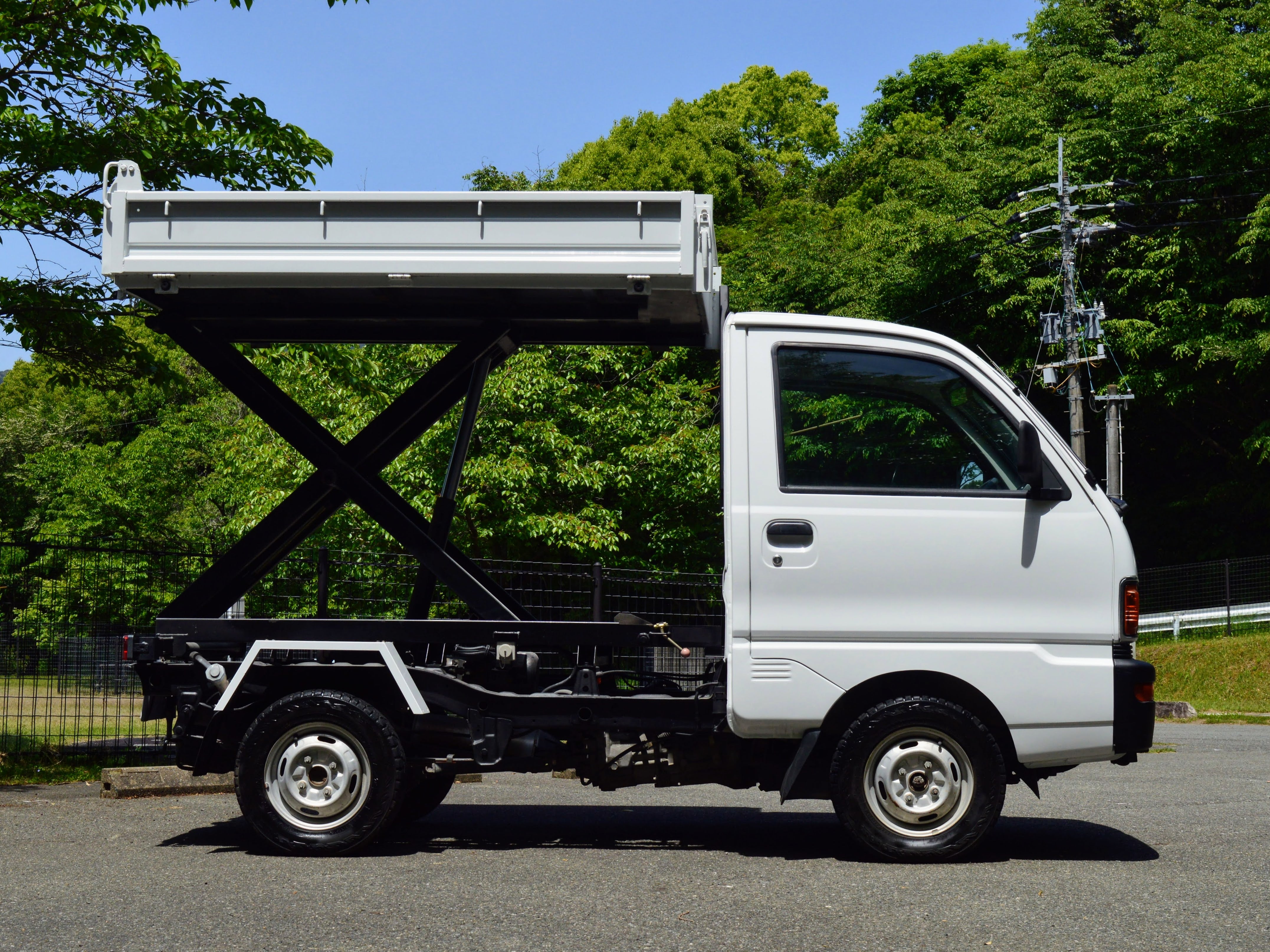 Scissor lifts can operate in two modes: dump and lift. Dump is just like a regular dump truck, where the bed lifts up from the cab-side, and can be used to easily dump its contents behind the truck. Lift is a function that elevates the bed straight up, vertically, into the air. It can be used to load goods to and from commercial loading docks, and also as a platform for working on higher areas that are hard to reach otherwise.